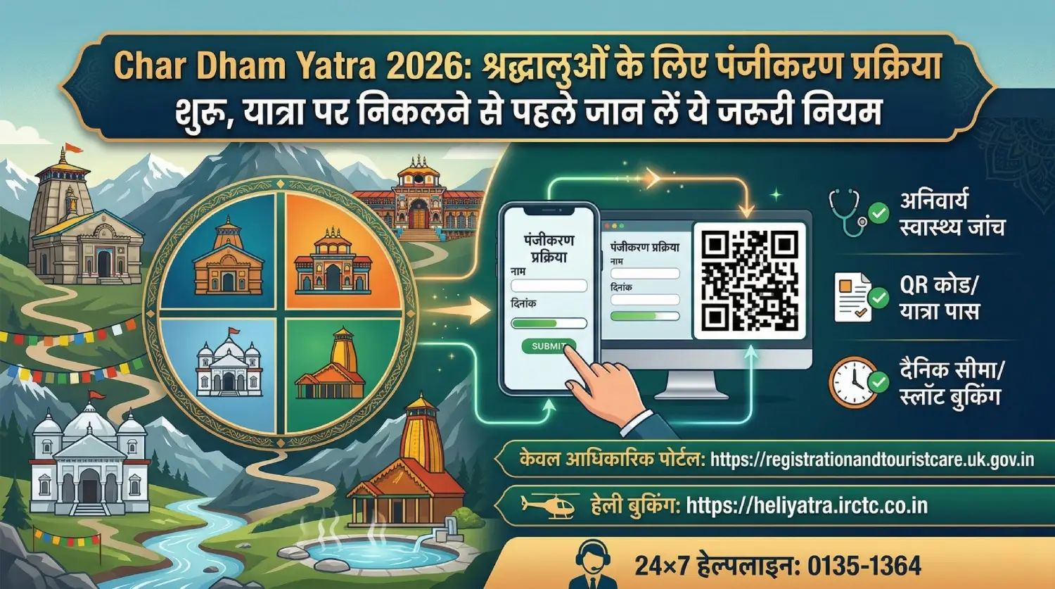 Char Dham Yatra 2026 । विश्व प्रसिद्ध चारधाम यात्रा 2026 के लिए उत्तराखंड सरकार ने कमर कस ली है। बाबा केदारनाथ, बद्रीनाथ, गंगोत्री और यमुनोत्री धाम के दर्शन के इच्छुक श्रद्धालुओं के लिए पंजीकरण (Registration) अनिवार्य कर दिया गया है। प्रशासन ने स्पष्ट किया है कि बिना वैध पंजीकरण के किसी भी यात्री को आगे जाने की अनुमति नहीं दी जाएगी।