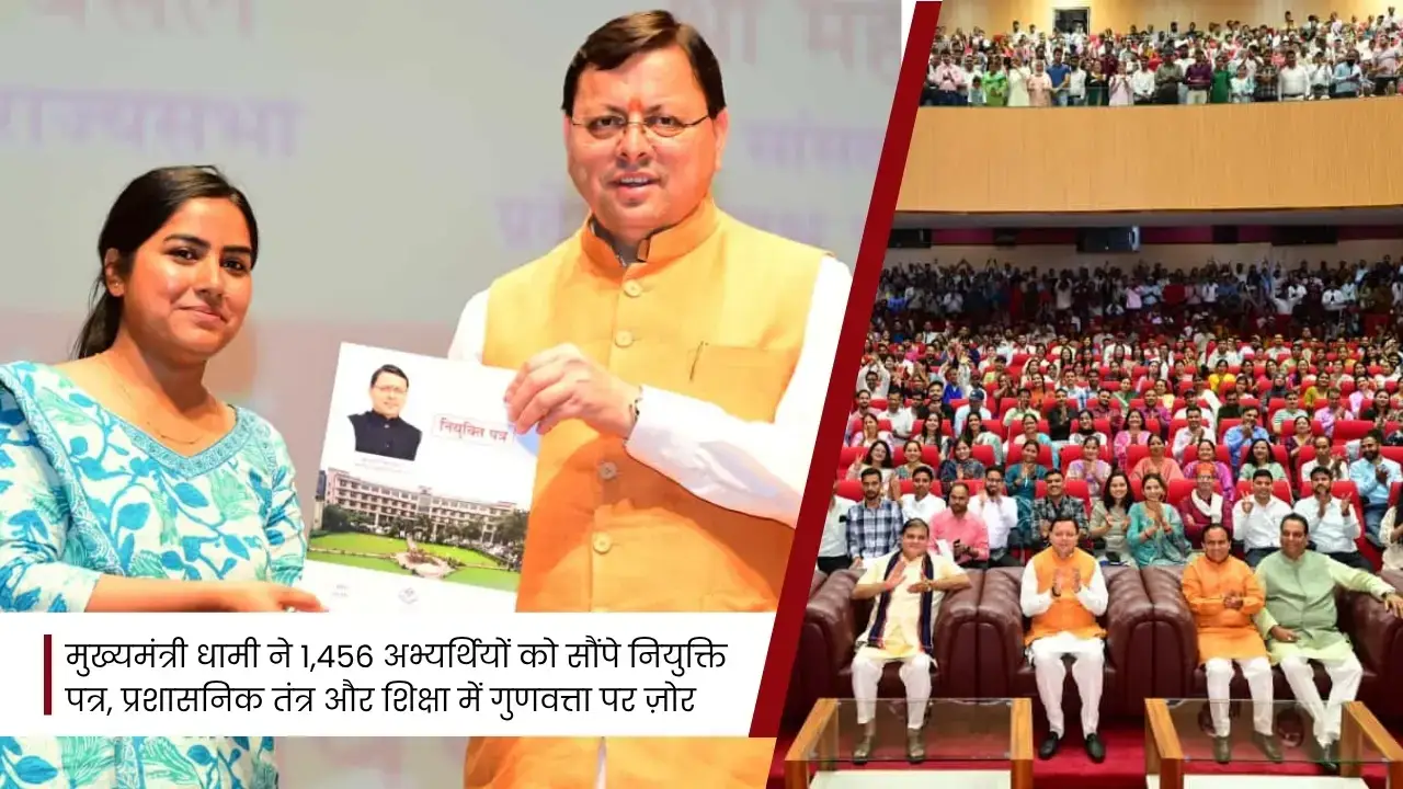 देहरादून। मुख्यमंत्री श्री पुष्कर सिंह धामी ने मंगलवार को दून मेडिकल कॉलेज, देहरादून में आयोजित एक समारोह में 1,456 युवाओं को नियुक्ति पत्र प्रदान किए। इन नियुक्तियों में लोक सेवा आयोग के माध्यम से चयनित 109 समीक्षा अधिकारी एवं सहायक समीक्षा अधिकारी और उत्तराखण्ड अधीनस्थ सेवा चयन आयोग के माध्यम से चयनित 1,347 सहायक अध्यापक (एल.टी.) शामिल हैं।