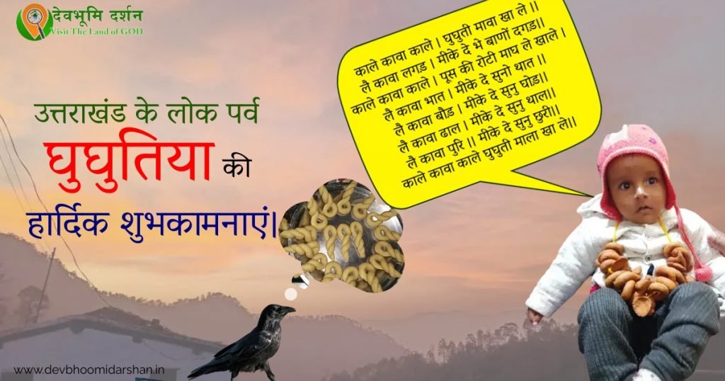 काले कावा काले घुघुती माला खा ले – उत्तराखंड के कुमाऊं मंडल में मकर संक्रांति को घुघुतिया त्यौहार के रूप में मनाया जाता है। मकर संक्रांति पर कुमाऊं का विशेष पकवान आटे और गुड़ के पाक के घुघुत बनाये जाते है। कौवे के लिए मकर संक्रांति के सारे पकवान के साथ घुघुत अलग निकाल लिए जाते हैं। घुघुतिया पर्व पर कौवों का विशेष महत्व होता है। घुघुतिया के दूसरे दिन बच्चे अपने गले में घुघुतों की माला डाल कर, कौवे के लिए एक कटोरे में अलग से पकवान के साथ घुघुत रख कर, काले कावा काले घुघुती माला खा ले , घुघुतिया त्यौहार के गीत गा कर कौवों को घुघुत खाने के लिए आमंत्रित करते हैं।