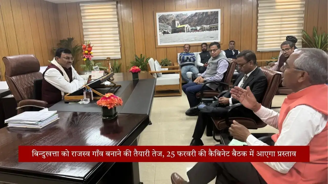 देहरादून: दशकों से लंबित बिन्दुखत्ता को राजस्व गाँव घोषित करने की मांग अब पूर्ण होने की दिशा में बढ़ रही है। मुख्य सचिव श्री आनंद बर्द्धन की अध्यक्षता में आयोजित एक महत्वपूर्ण बैठक में इस संबंध में निर्णायक निर्देश दिए गए हैं। मुख्य सचिव ने अधिकारियों को निर्देशित किया है कि बिन्दुखत्ता को राजस्व गाँव बनाने का औपचारिक प्रस्ताव आगामी 25 फरवरी को होने वाली कैबिनेट बैठक में अनिवार्य रूप से प्रस्तुत किया जाए।